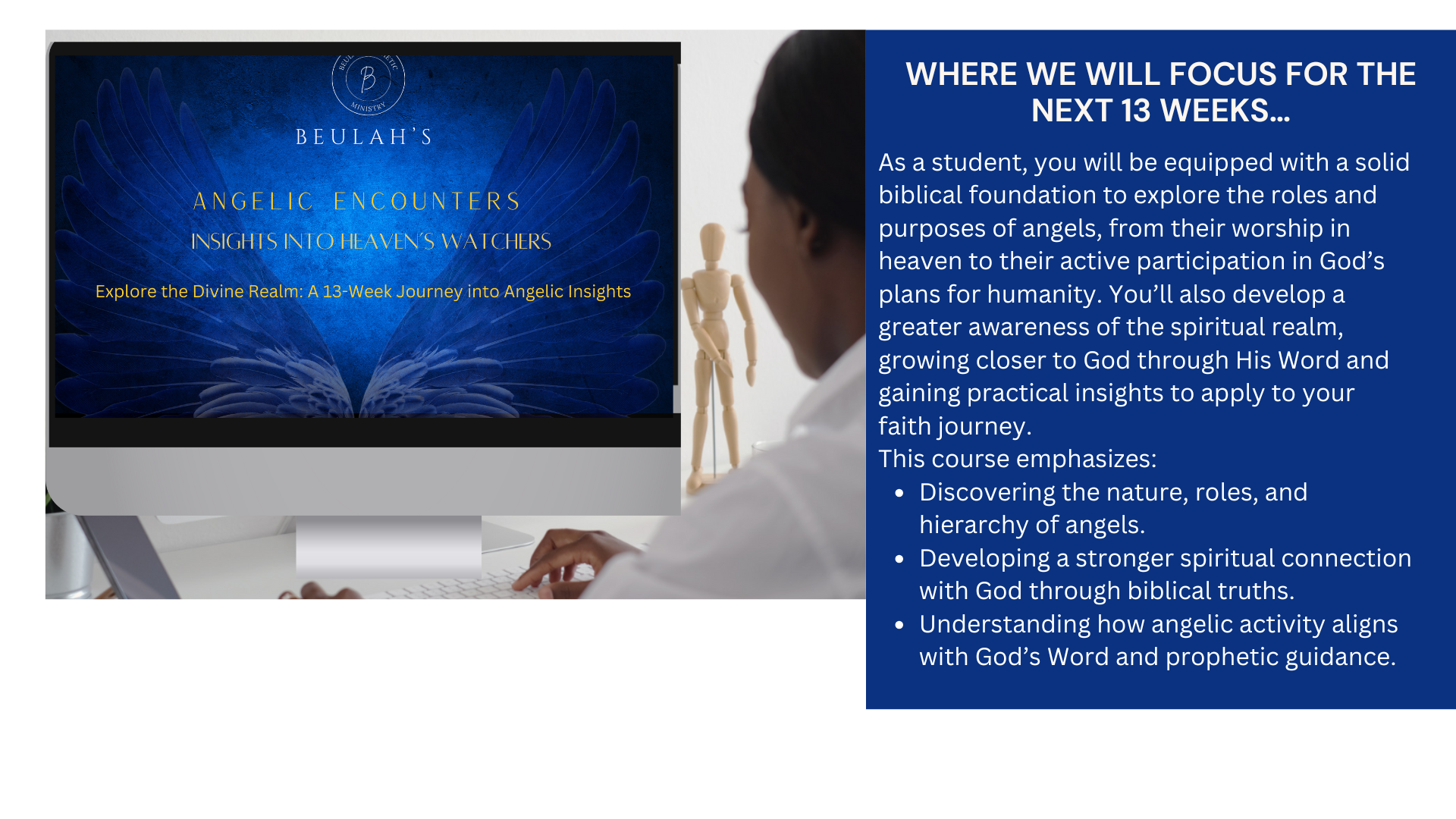 The Angelic Encounters course is a 13-week specialty program designed to equip believers with a deeper understanding of angelic activity and their role in prophetic ministry. This course combines biblical teaching, spiritual discernment, and practical tools to help you recognize and engage with God’s angelic messengers effectively.